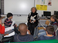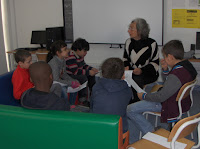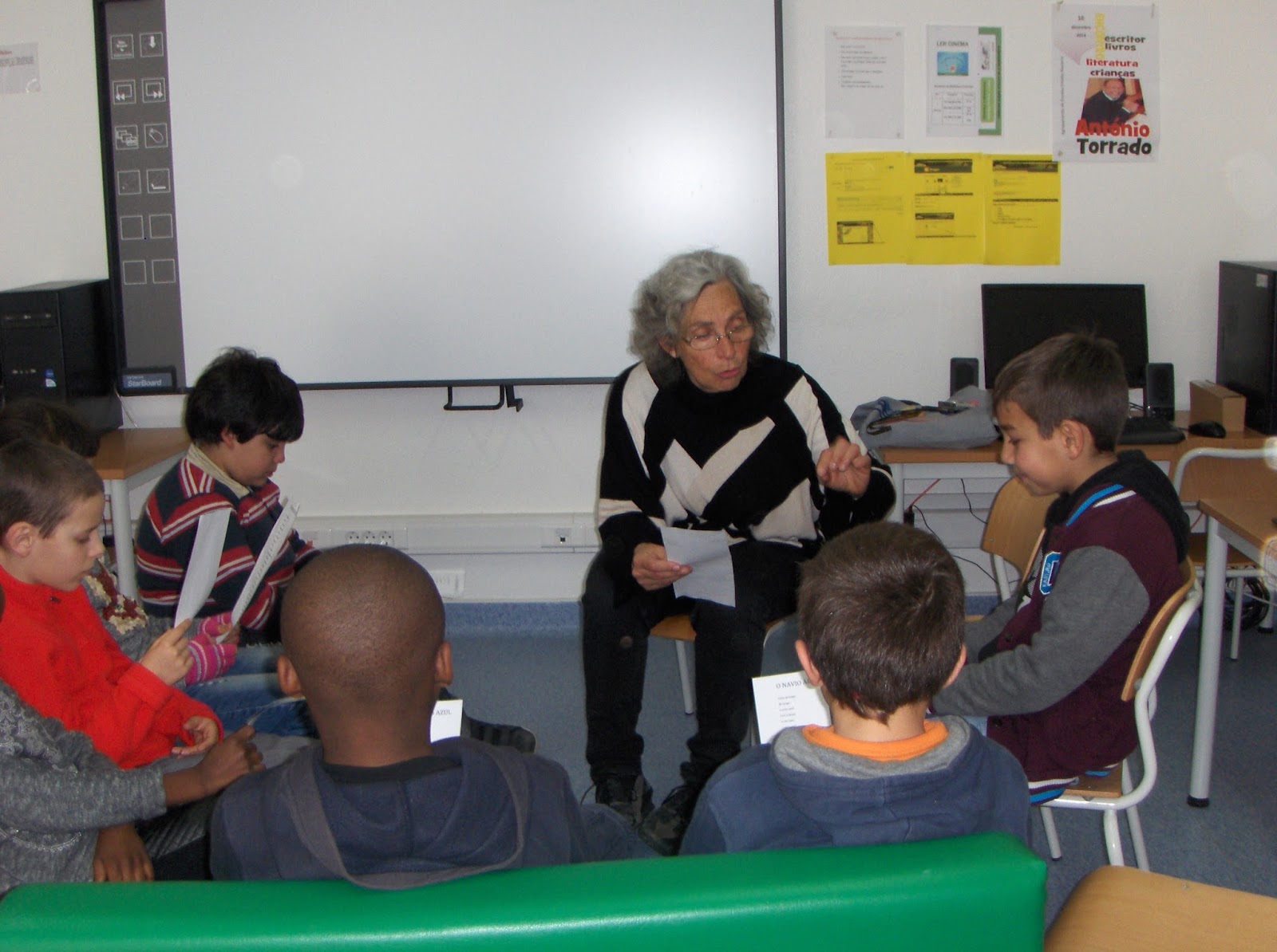 Enquanto unas trabalham no livro-objeto "O navio azul" outros preparam-se para apresentar o poema às restantes turmas da escola, com a ajuda preciosa da Manuela Caeiro (reforço as palavras "ajuda preciosa").